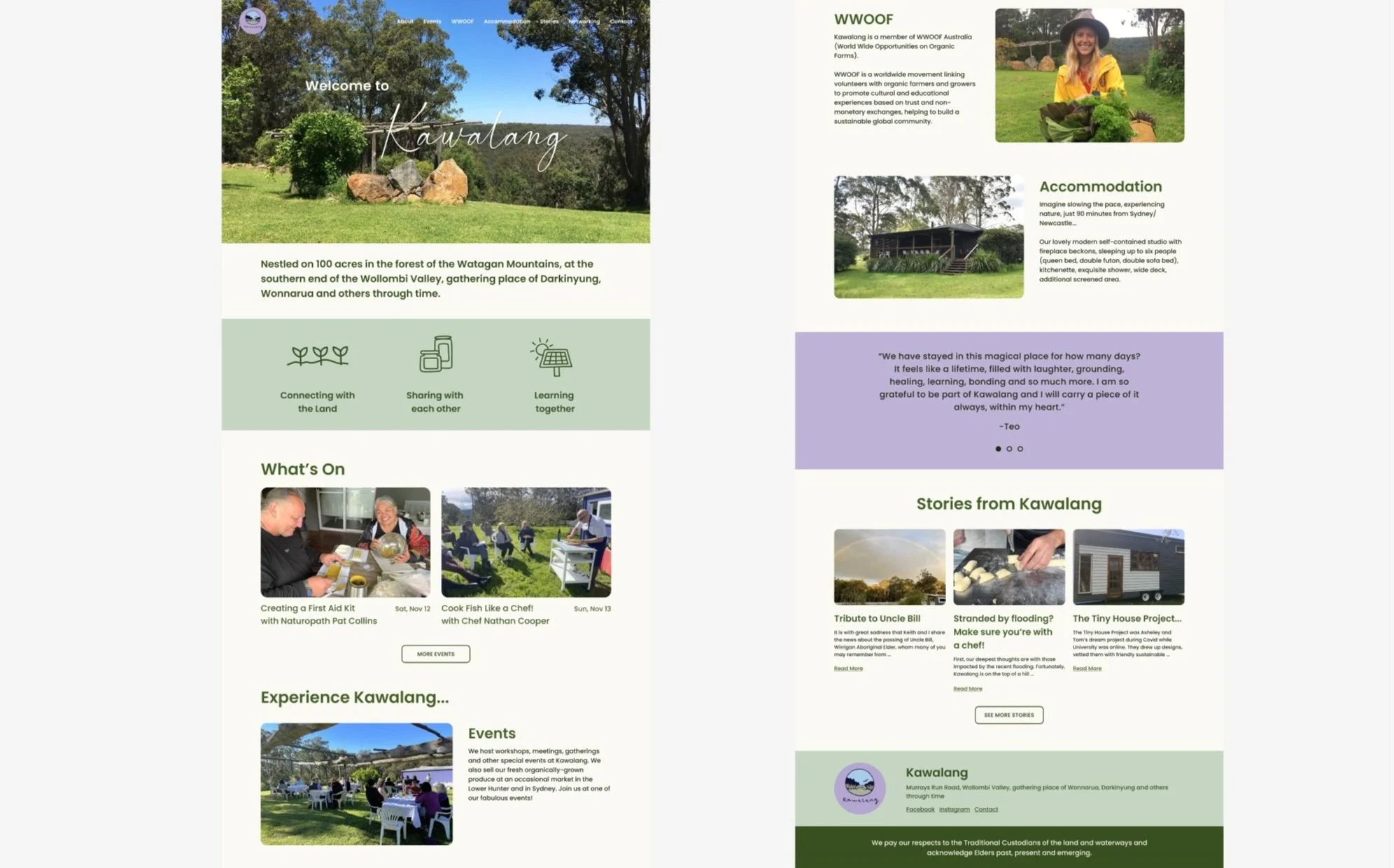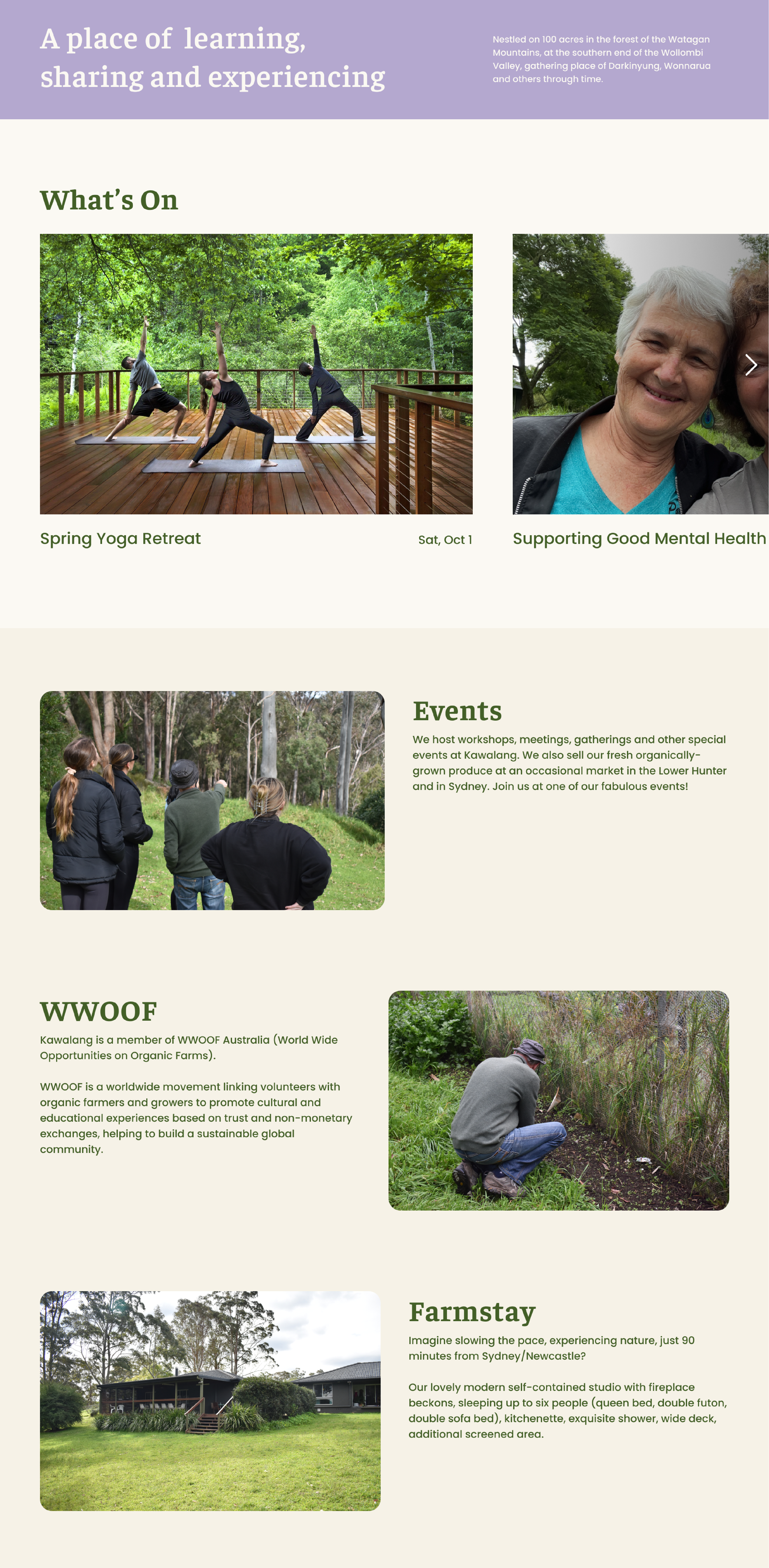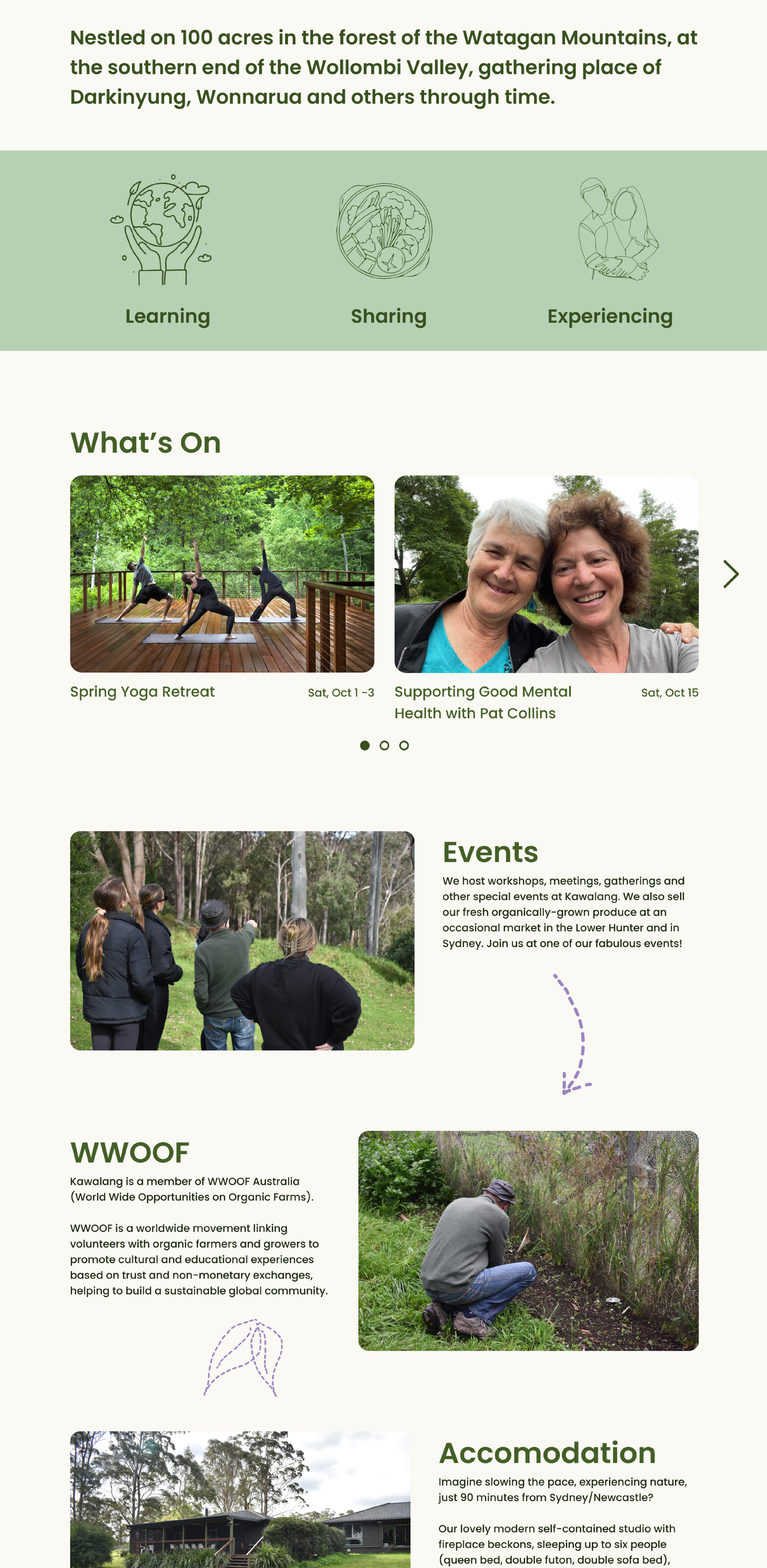 These four images show some of the progression of the home page design in Figma. There were a variety of considerations I had in mind throughout this development. First was the typography. Initially, I used a serif font for the titles to provide a sense of trustworthiness and warmth. The client wanted something more friendly and less formal, so I switched to Poppins, a sans-serif font. This soft, welcoming feeling was built upon by rounding the corners of the images, using a generally warm colour palette, and icons with a thicker line weight that feels more friendly. Coloured blocking the different sections helps emphasise each one, with the green sections reflecting Kawalang’s strong connection to nature. Purple was used as an accent colour and was brought in more in the design we built in Squarespace. Hierarchy is created by using different sizes and weights of Poppins that emphasise the headings and make it easy to navigate the content on the page. Leaving white space in the composition creates breathing room and helps it be more balanced and relaxed. Finally, the scale of the text and sections was optimised for viewing on a computer and ensuring it was easy for older adults to read the text.