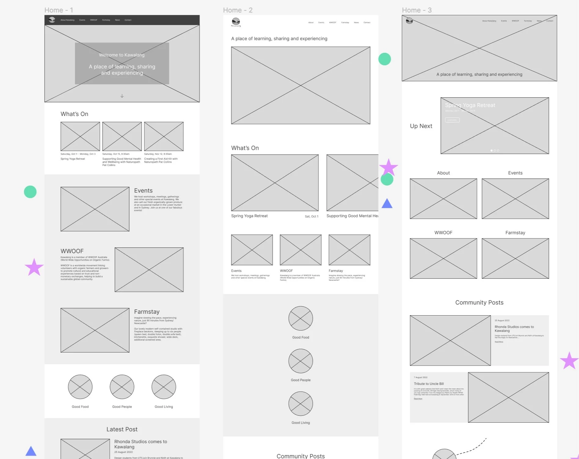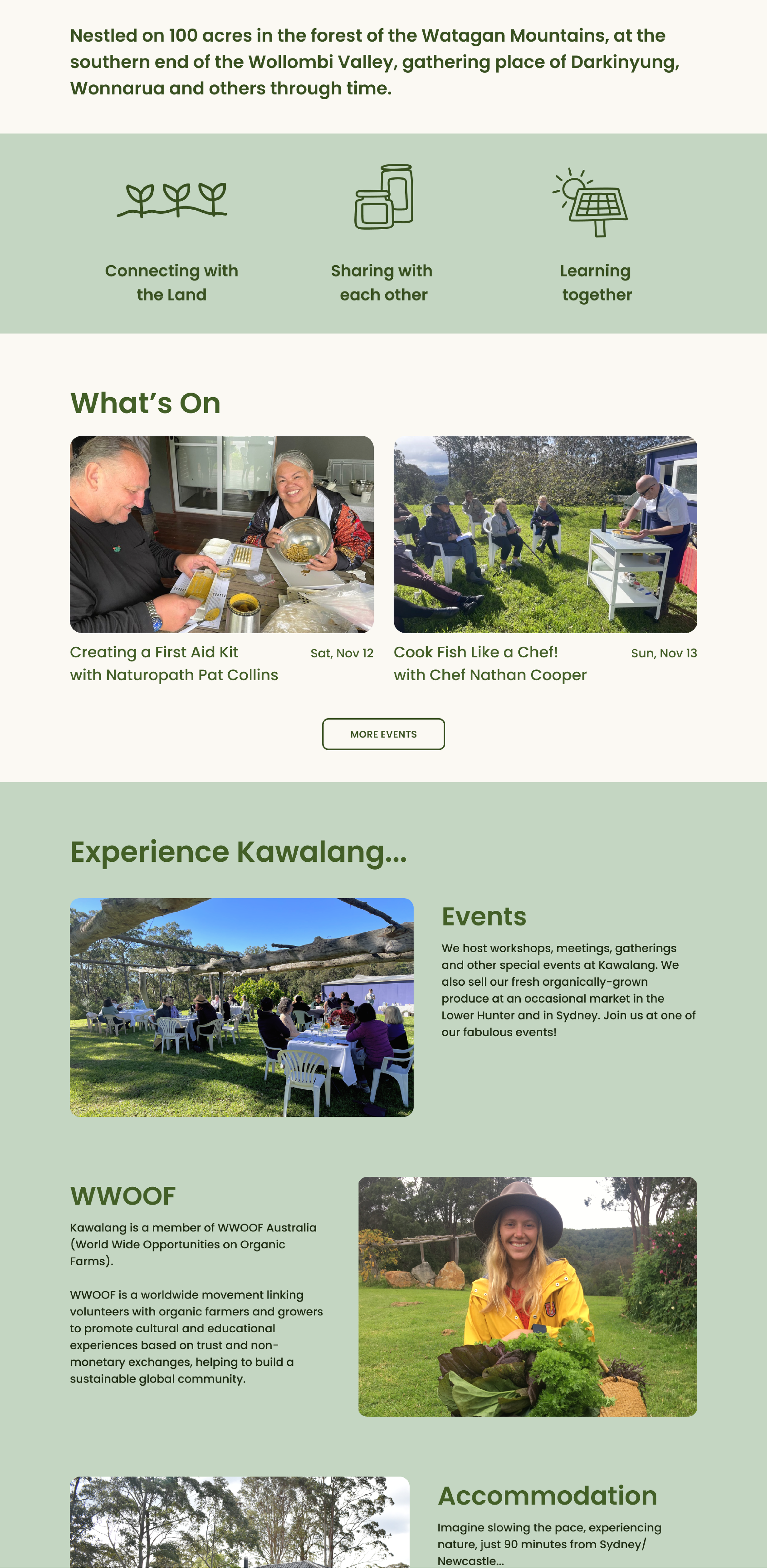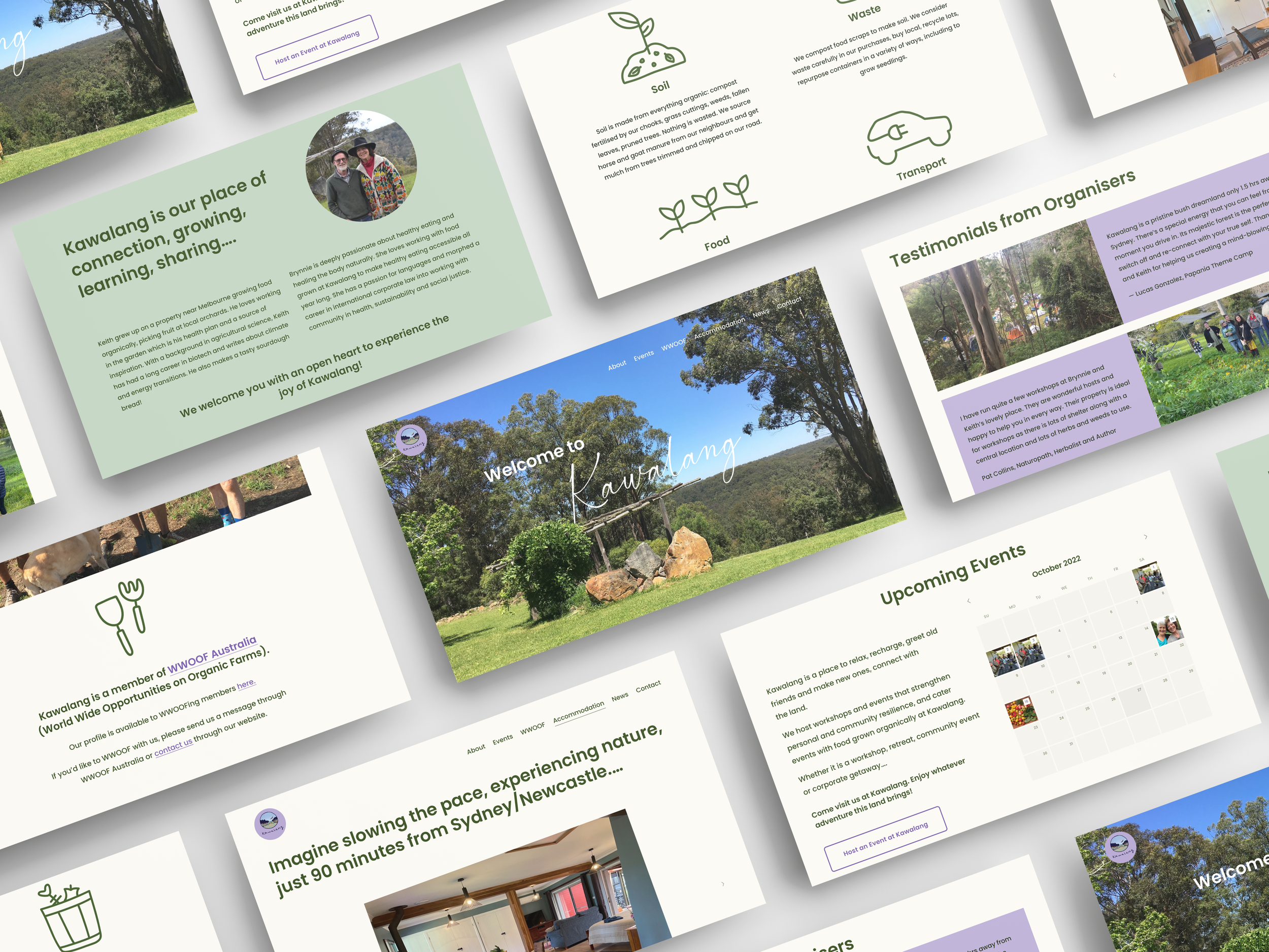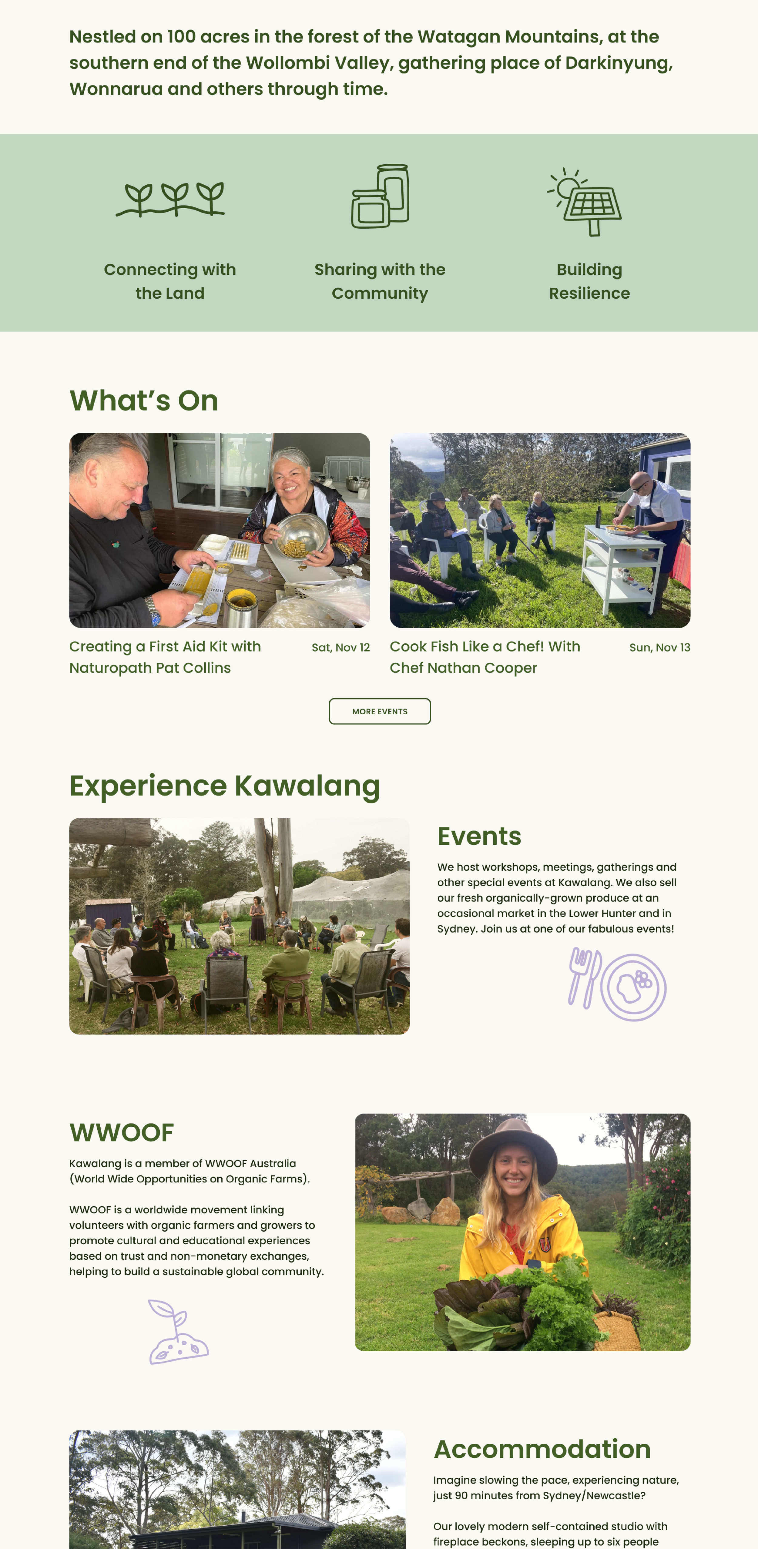 These four images show some of the progression of the home page design in Figma. There were a variety of considerations I had in mind throughout this development. First was the typography. Initially, I used a serif font for the titles to provide a sense of trustworthiness and warmth. The client wanted something more friendly and less formal, so I switched to Poppins, a sans-serif font. This soft, welcoming feeling was built upon by rounding the corners of the images, using a generally warm colour palette, and icons with a thicker line weight that feels more friendly. Coloured blocking the different sections helps emphasise each one, with the green sections reflecting Kawalang’s strong connection to nature. Purple was used as an accent colour and was brought in more in the design we built in Squarespace. Hierarchy is created by using different sizes and weights of Poppins that emphasise the headings and make it easy to navigate the content on the page. Leaving white space in the composition creates breathing room and helps it be more balanced and relaxed. Finally, the scale of the text and sections was optimised for viewing on a computer and ensuring it was easy for older adults to read the text.