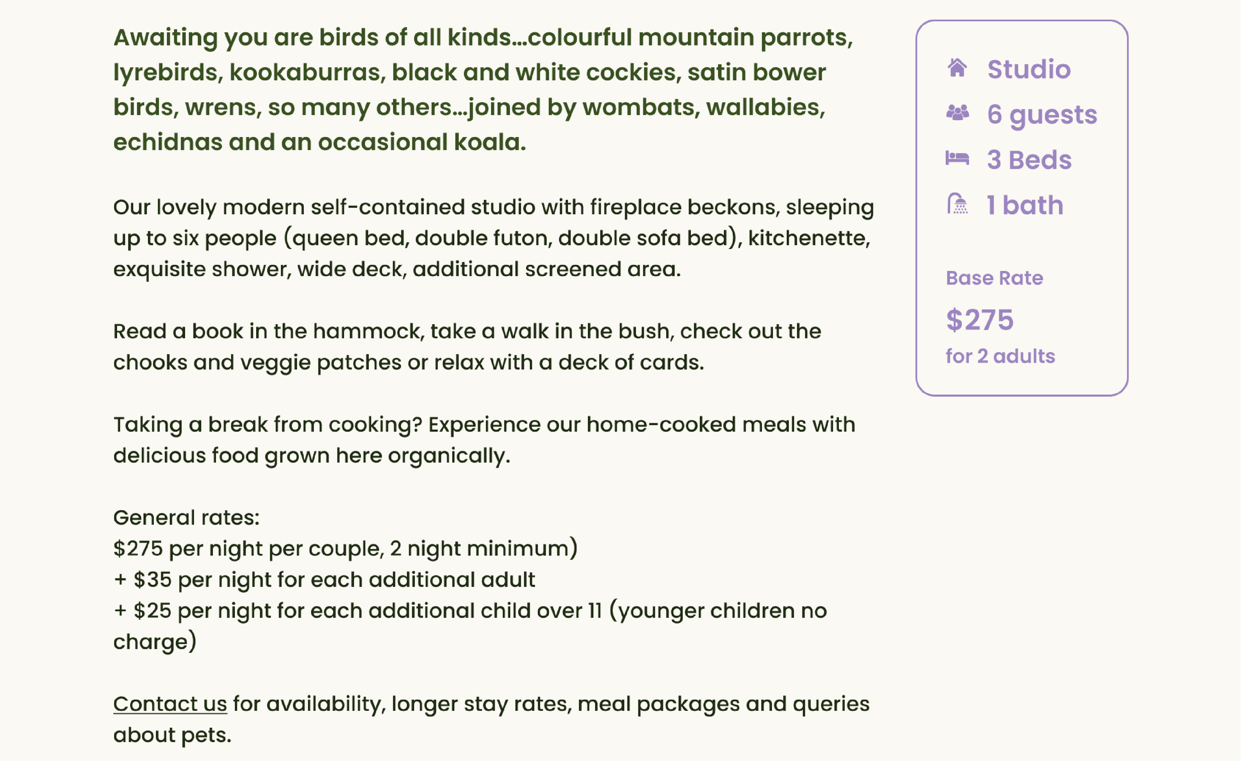 The goal of the accommodation information is to sell the experience of staying there. To do this, I created a visual hierarchy that focuses on the first paragraph due to the larger text size, lighter colour and positioning on the left of the page. The attention is then drawn to the key statistics as they’re in purple, in a container and on the right side. The icons have a solid fill which, along with the purple, feels friendly. Finally, the attention goes to the rest of the body copy which I formatted to ensure there are no orphans.