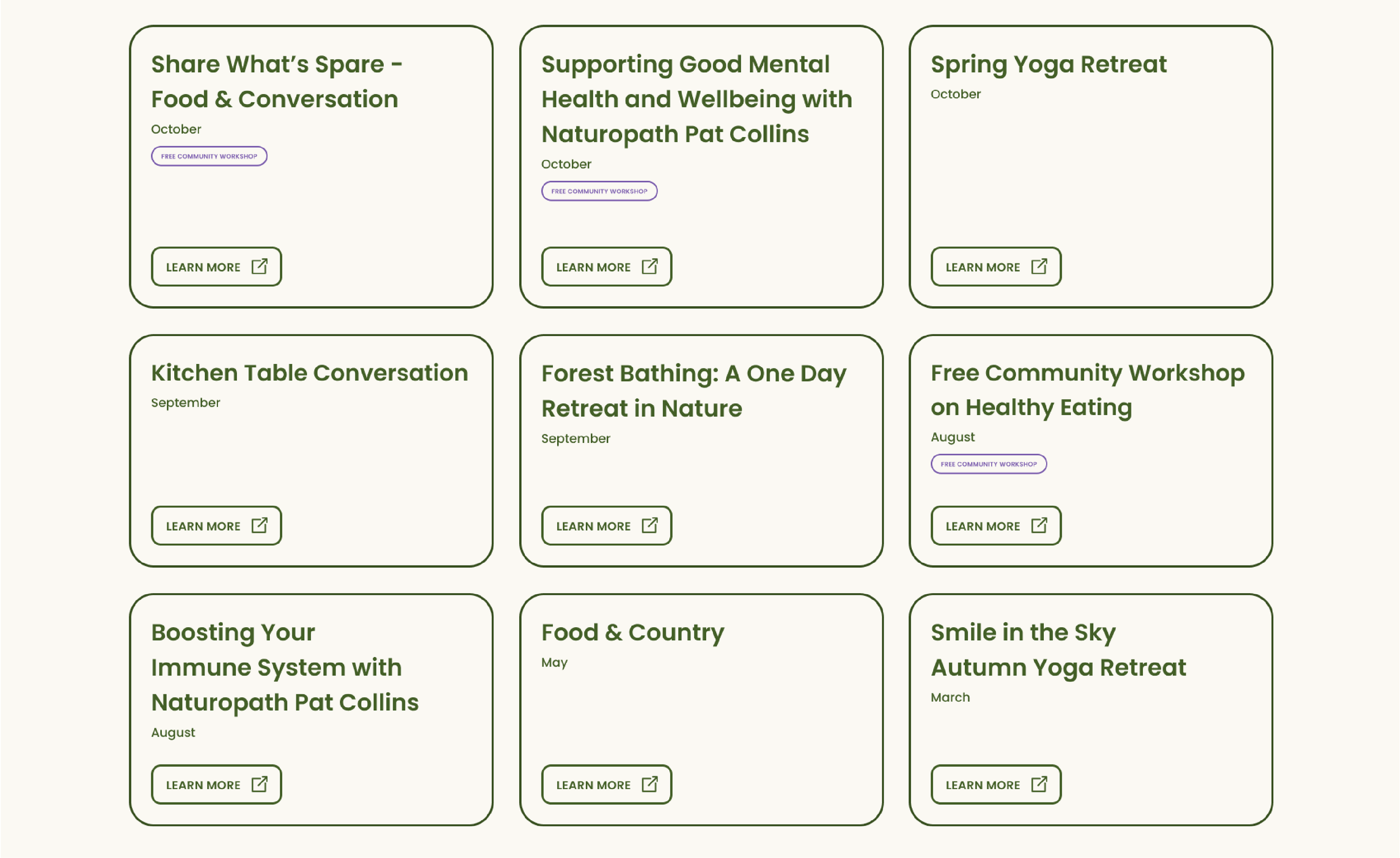 This Figma design wasn’t able to be replicated due to the constraints of Squarespace. However, it shows a strong grid and hierarchy. To ensure the rows were all the same height, more white space was needed in some of the boxes so it feels balanced. The rounded corners ensure the grid doesn’t have hard lines or sharp edges that clash with the flow and welcoming feel of the design. Purple is used to emphasise the events that are labelled as ‘Free community workshops’. The thickness of the lines was chosen so they still feel consistent and balanced within the overall design, without being overbearing or too delicate.