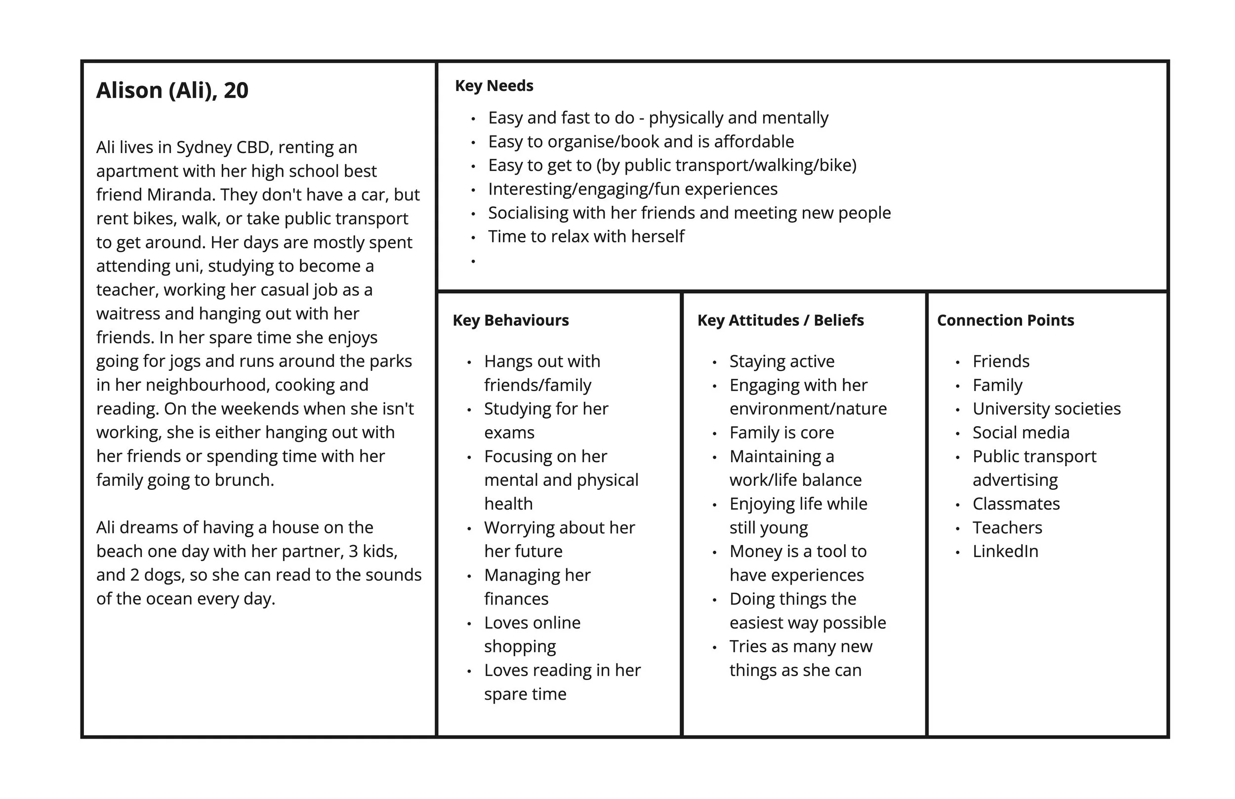 Based on the empathy map, we also created a user profile. This helped us to understand the motivating factors behind behaviour, including needs and attitudes/beliefs. This profile became a reference point we could use to test our ideas against.