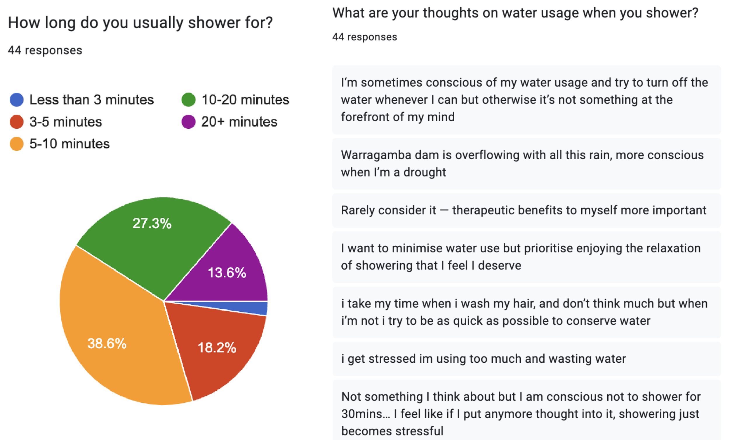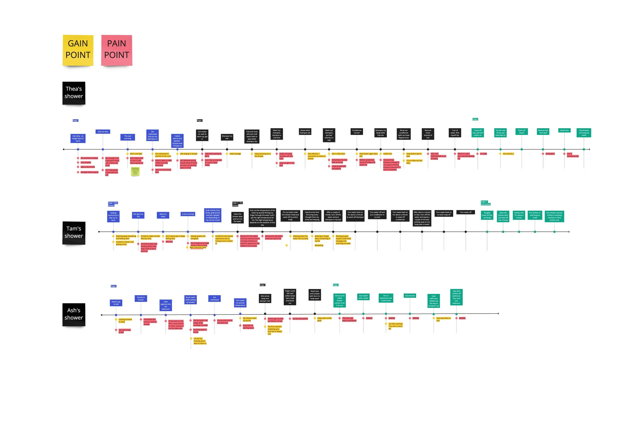 We surveyed 44 young experience seekers to understand the diverse experiences people have showering. We identified a theme of conflicting pain and gain points, where people are conscious of their water usage but don’t want to stress over it because they value their relaxation time. Therefore, the challenge was, ‘How might we save water without sacrificing relaxation in the shower?’.