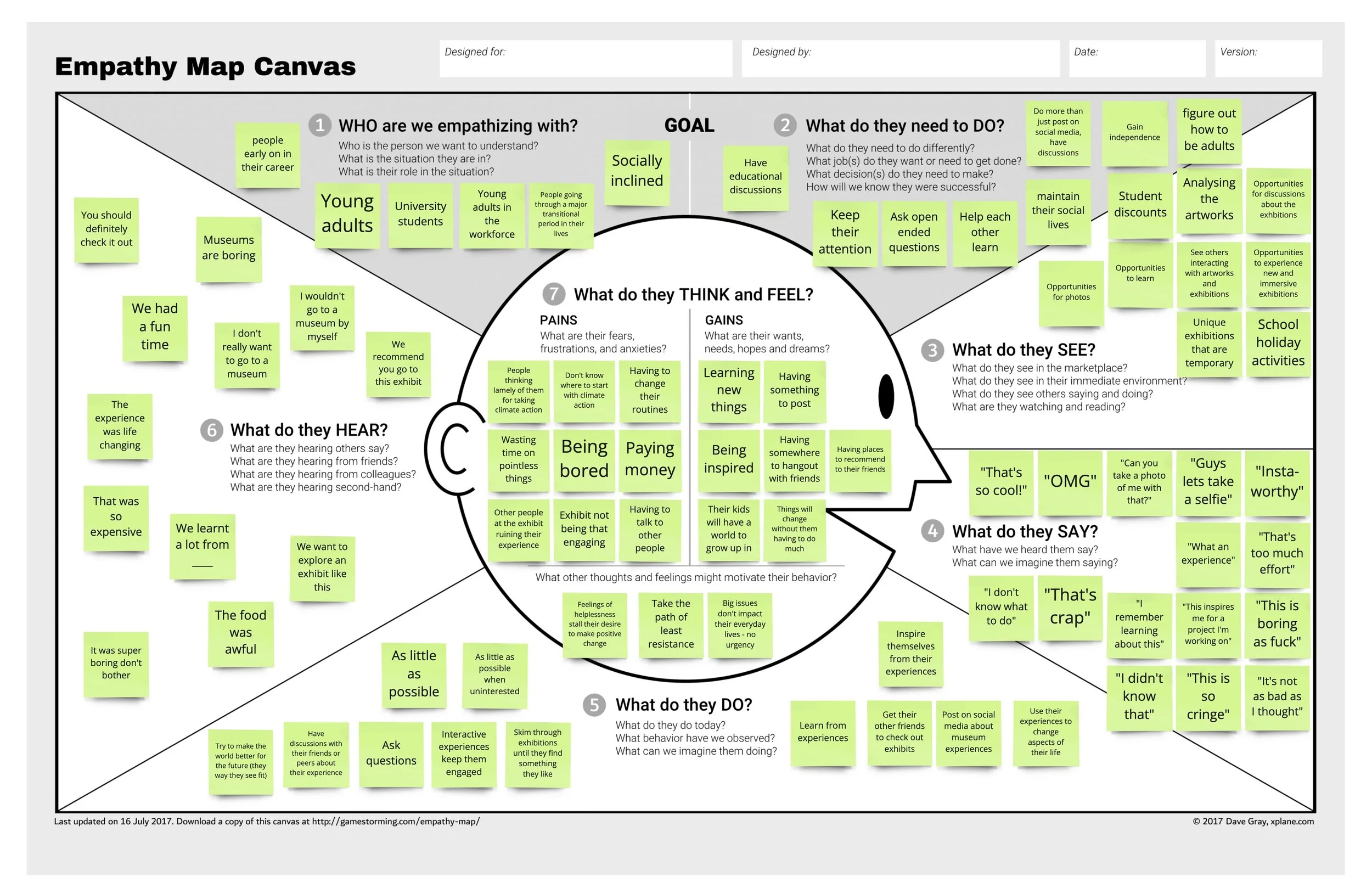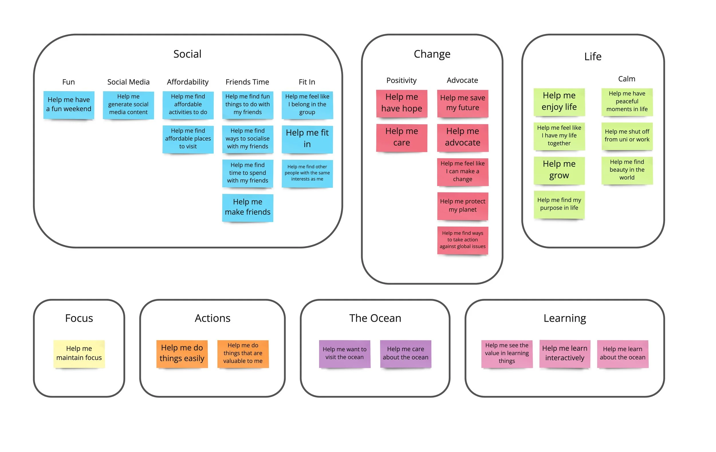 After doing six interviews within our customer segment of young experience seekers (age 18-39), we compiled an empathy map to consolidate our understanding of this target audience. We were curious about the thoughts and feelings that motivated their behaviour and, moving forward, delved into why this was.